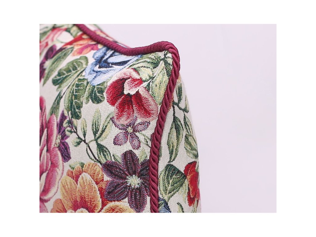Gobelínový vankúš so vzorom pestrofarebných kvetov a dekoračnou šnúrou po obvode.