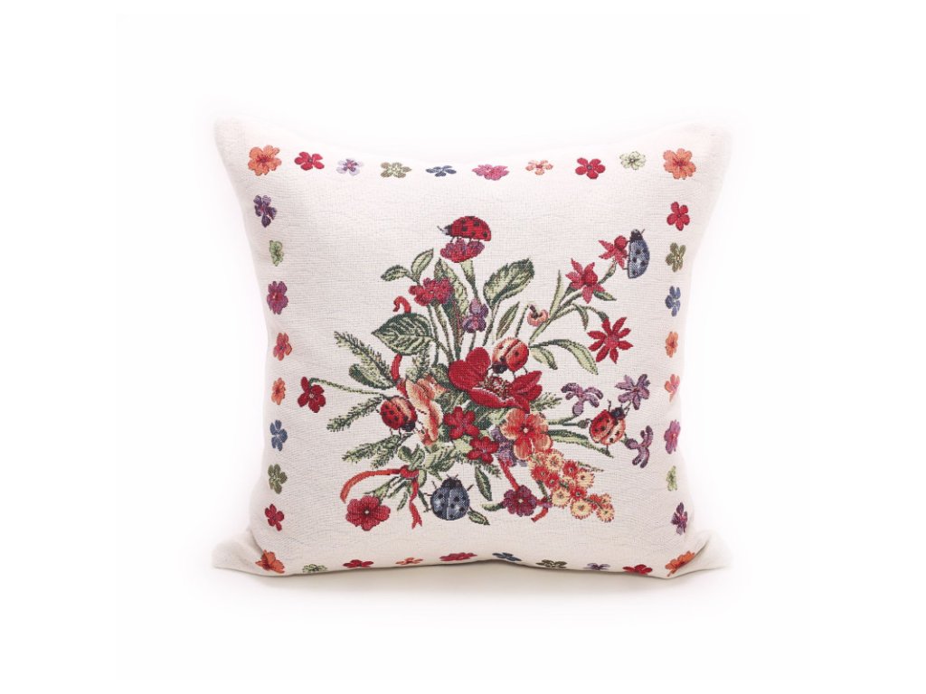 Gobelínový vankúš so vzorom lúčnych kvetov.