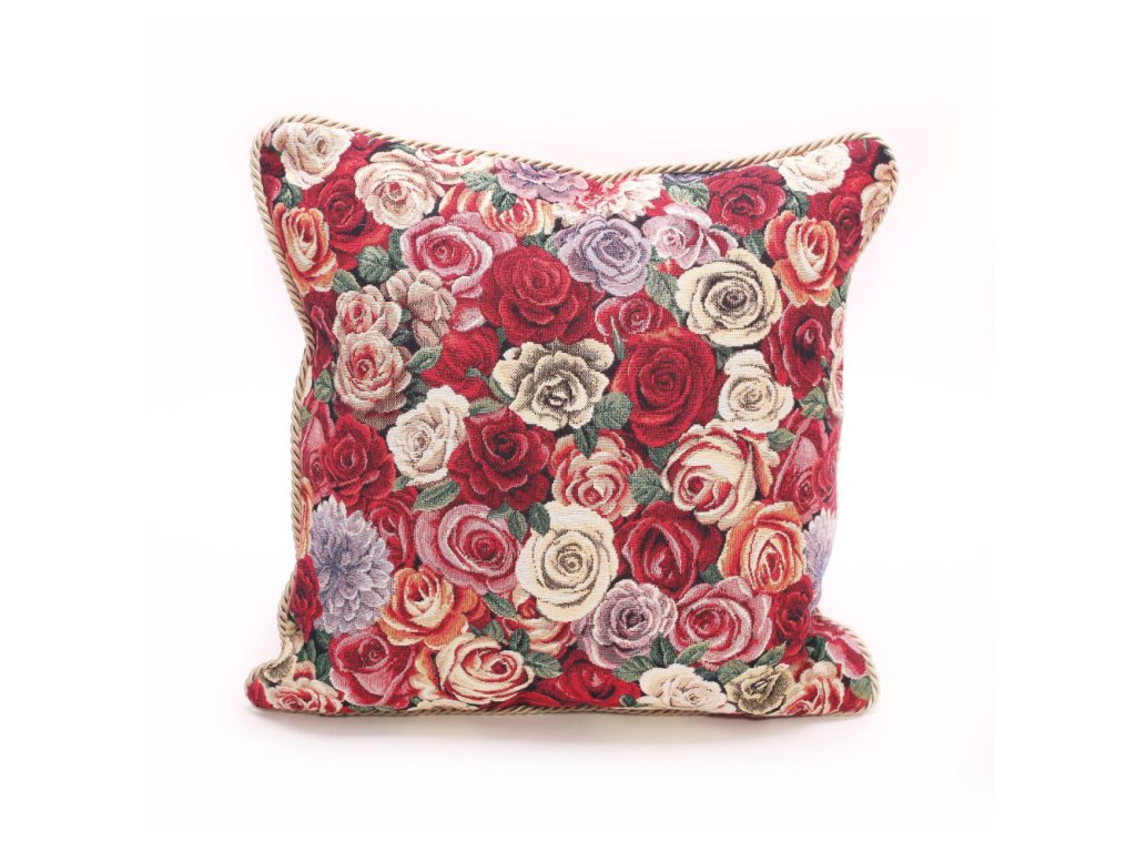 Gobelínový vankúš so vzorom kvetov ruží a dekoračnou šnúrou po obvode.