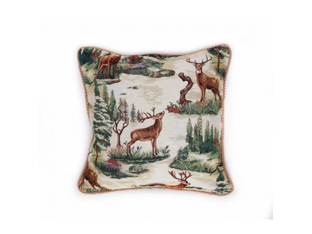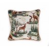 Gobelínový vankúš so vzorom jeleňa a lesa.