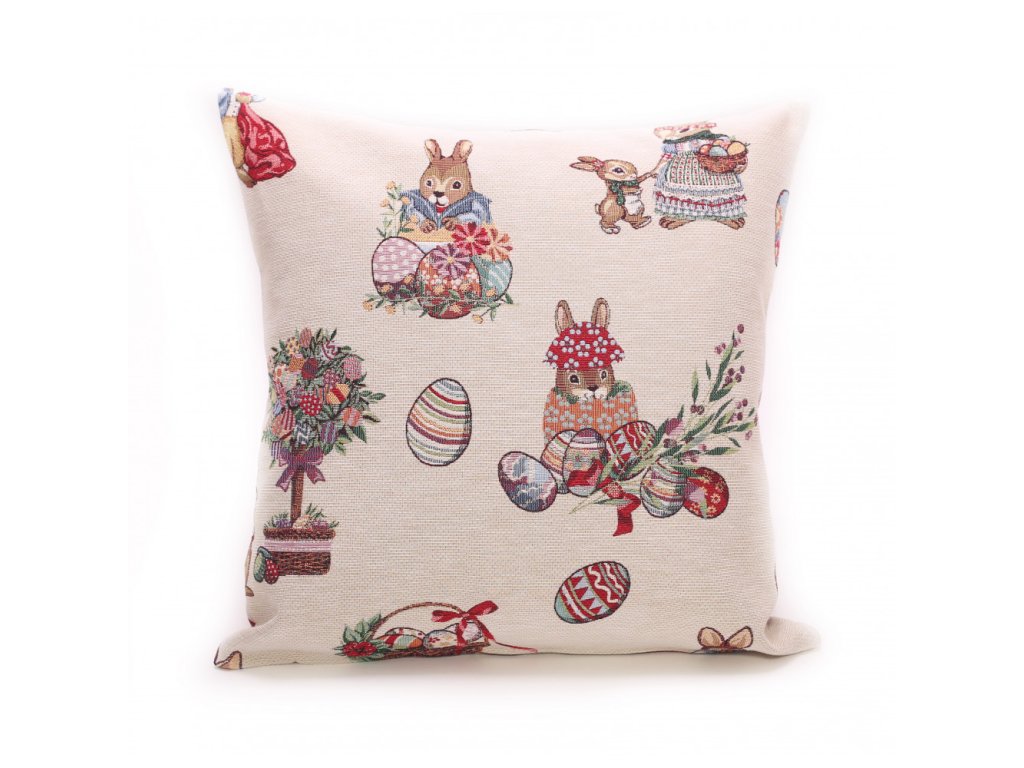 Veľkonočný gobelínový vankúš sa vzorom zajačikov a vajíčok veľkosti 45 x 45cm