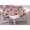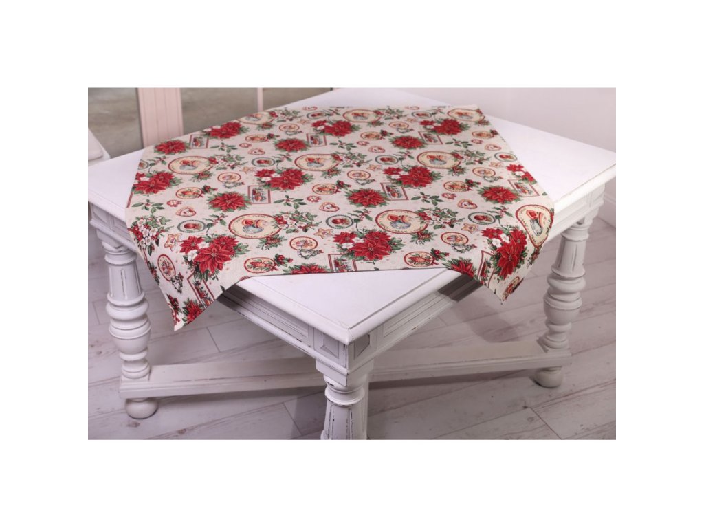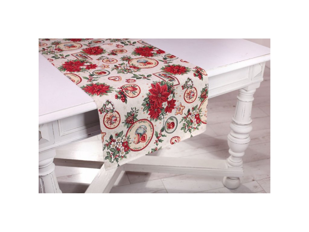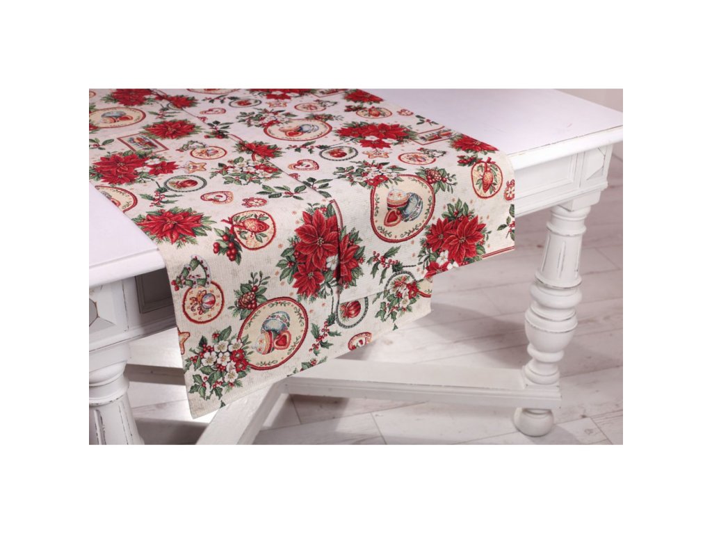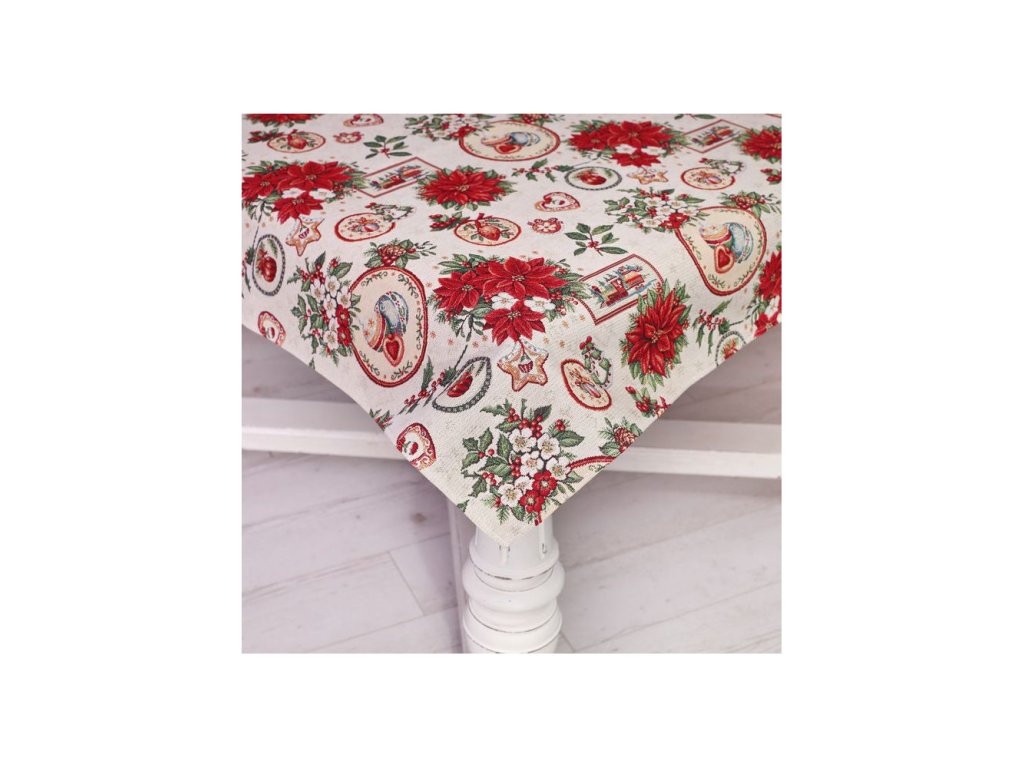 Vianočný gobelínový obrus so vzorom vianočnej ruže a vianočných gulí.