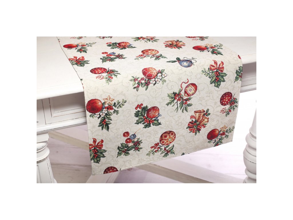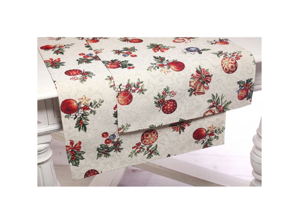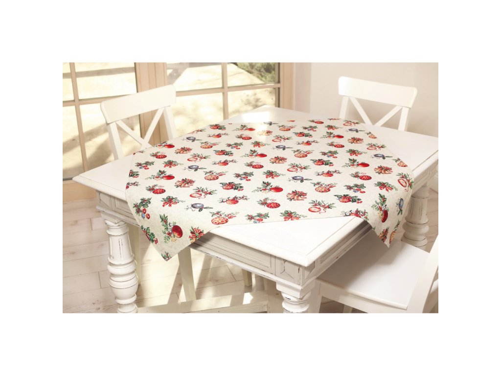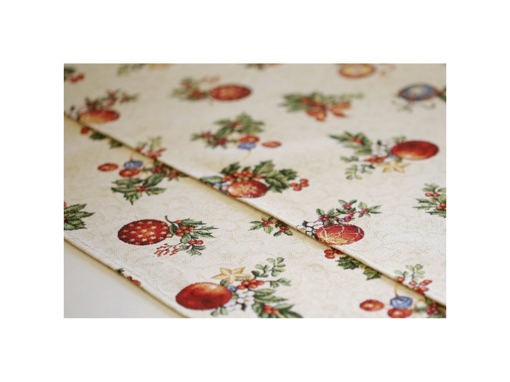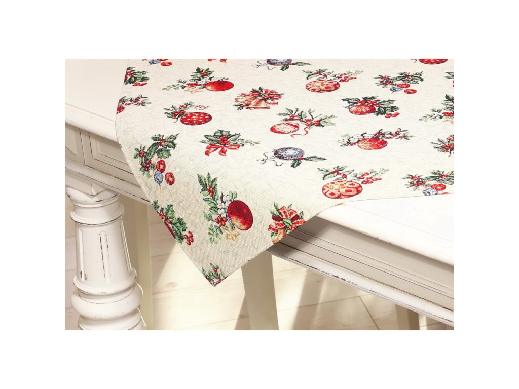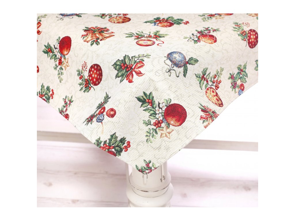Vianočný gobelínový obrus so vzorom vianočných gulí .