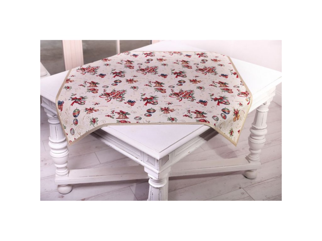Vianočný gobelínový obrus so vzorom vianočných zvončekov a gulí so zlatým lemom po obvode.