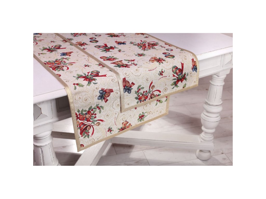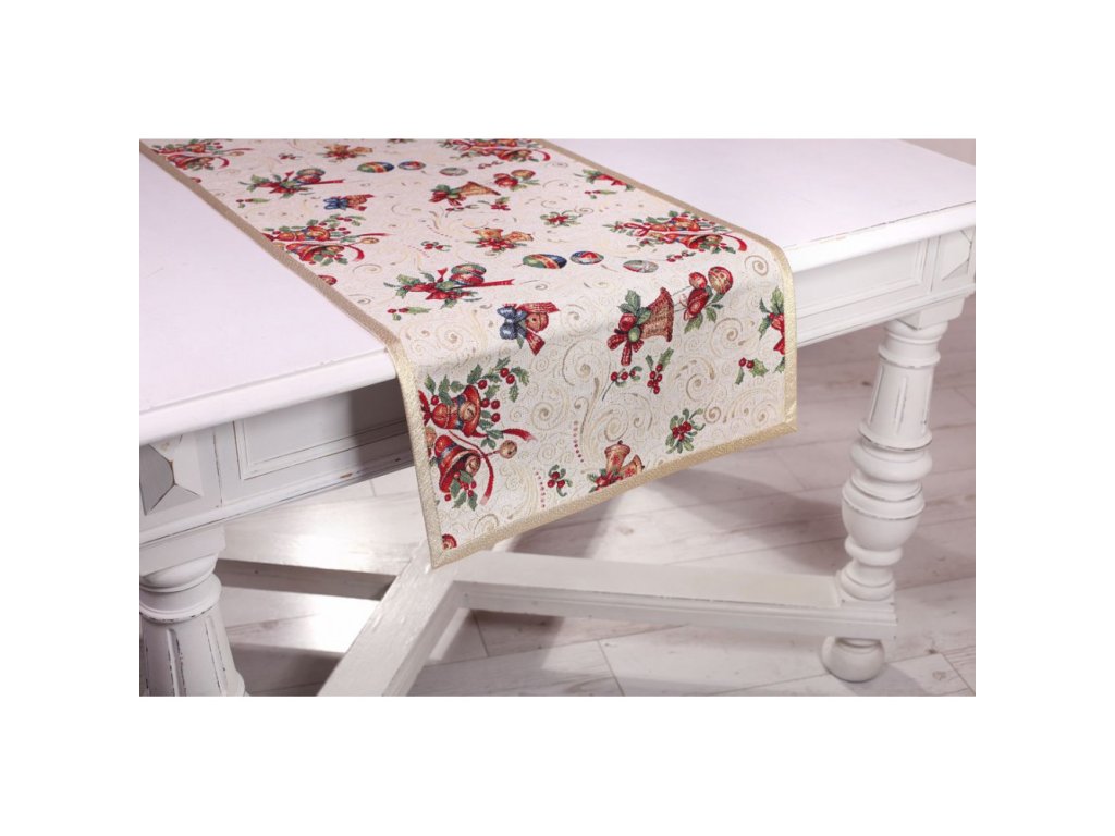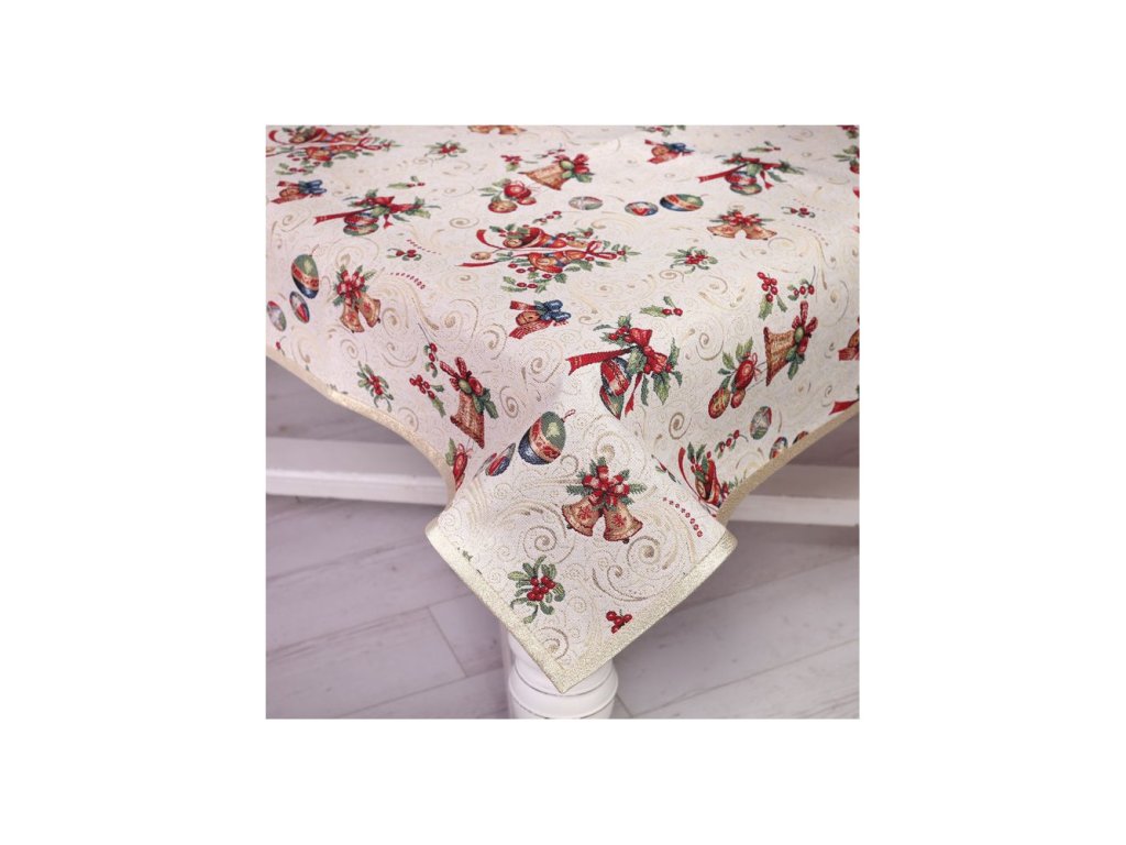 Vianočný gobelínový obrus so vzorom vianočných zvončekov a gulí so zlatým lemom po obvode.