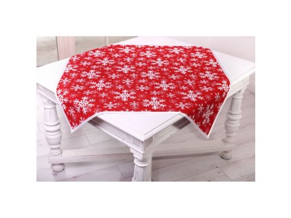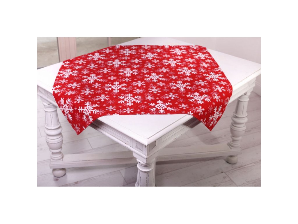 Vianočný gobelínový obrus so šenylom so vzorom bielych snehových vločiek.