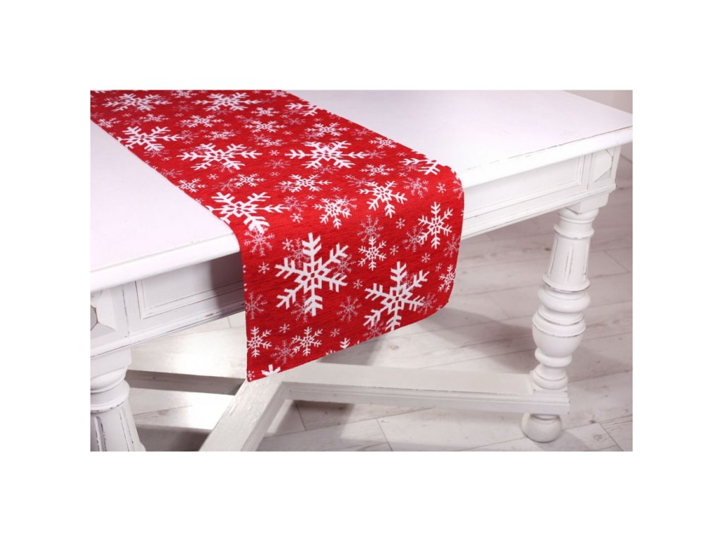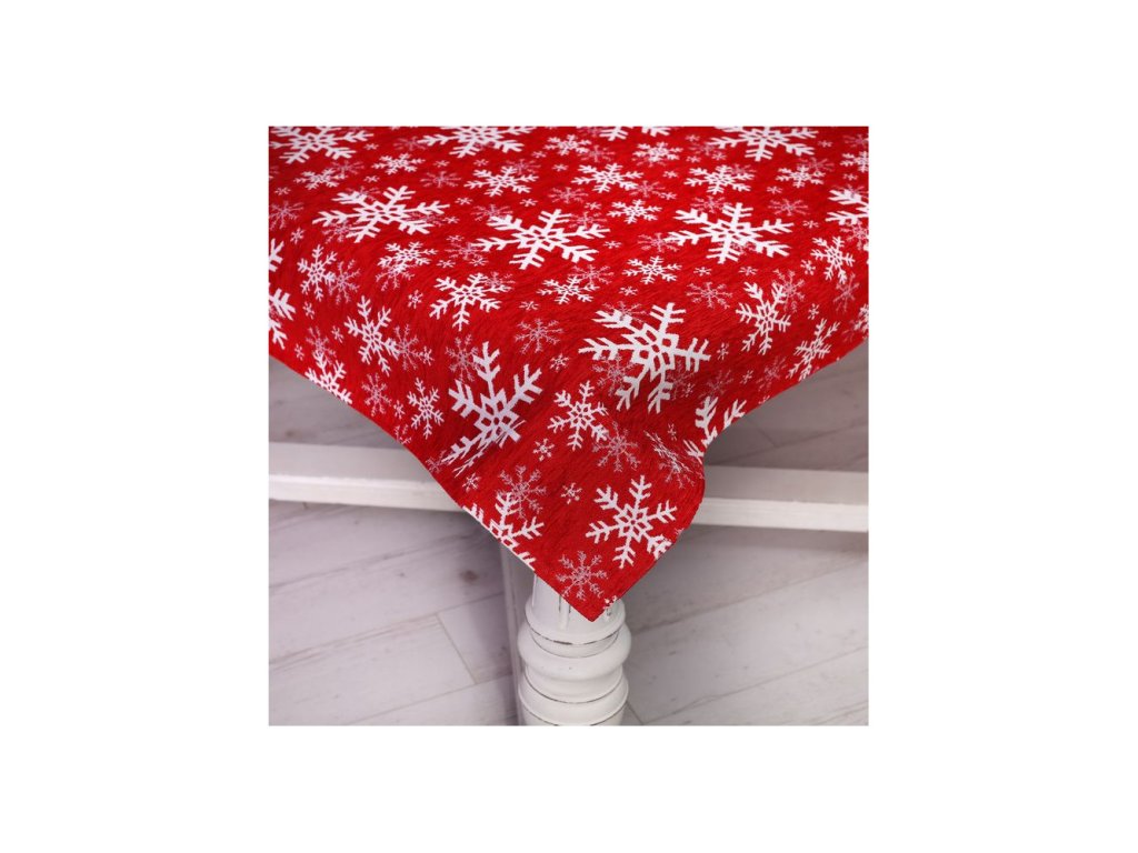 Vianočný gobelínový obrus so šenylom so vzorom bielych snehových vločiek.