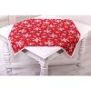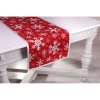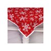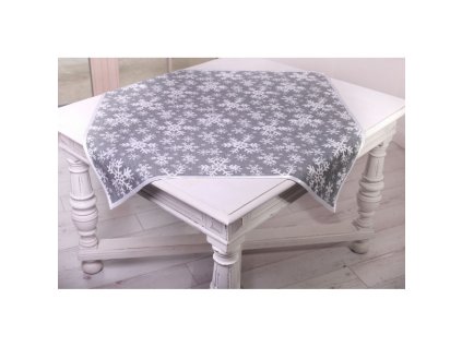Vianočný gobelínový obrus so šenylom so vzorom bielych snehových vločiek a bielym lemom po obvode.