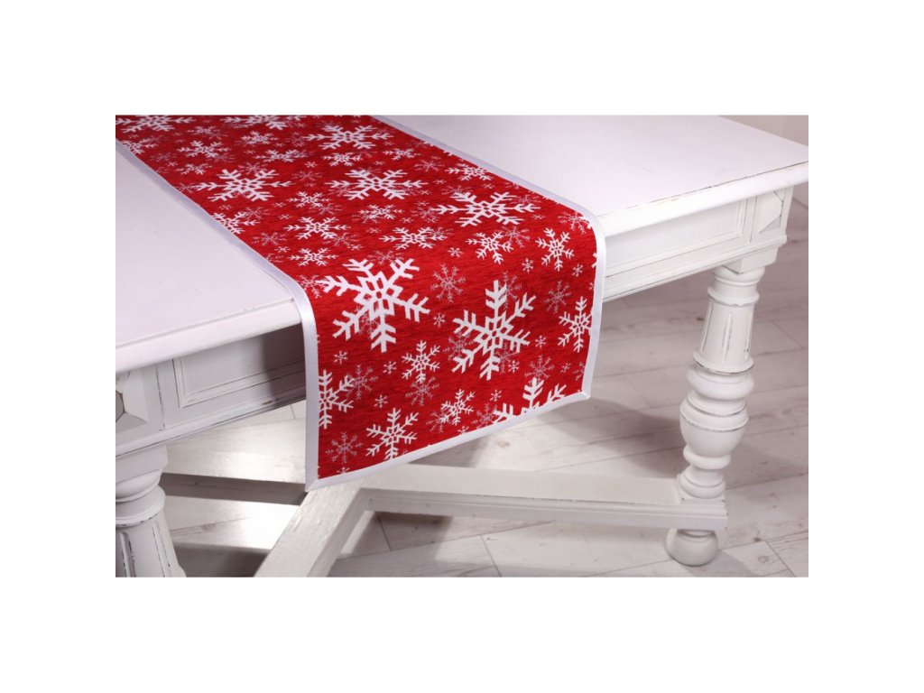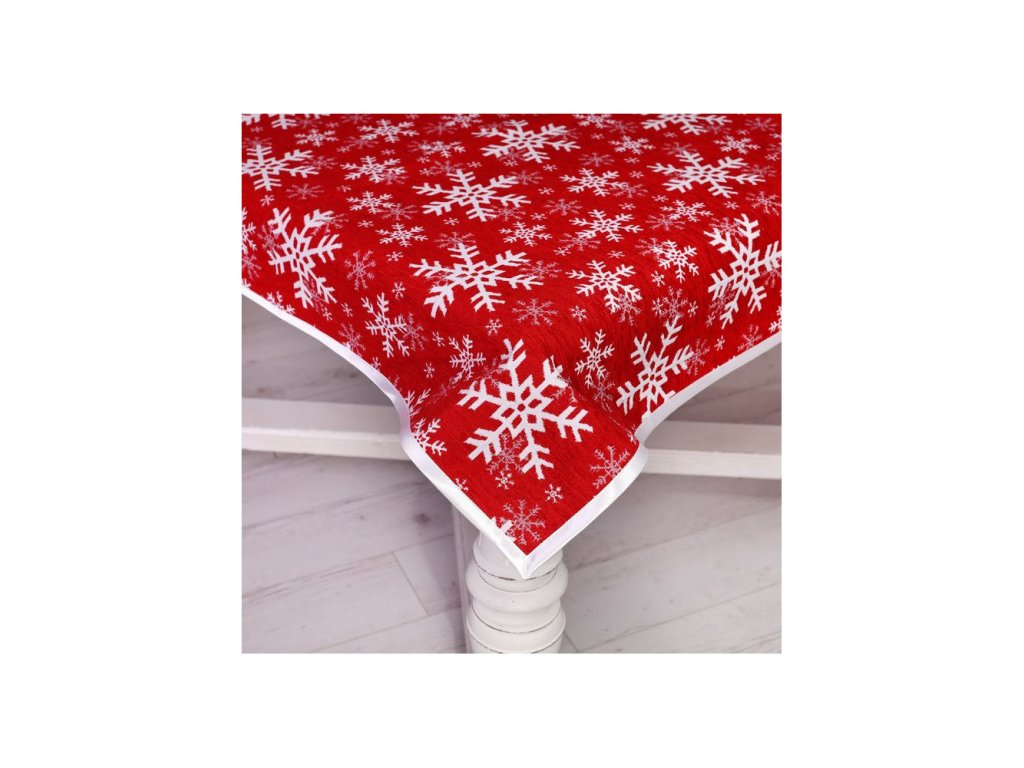Vianočný gobelínový obrus so šenylom so vzorom bielych snehových vločiek a bielym lemom po obvode.