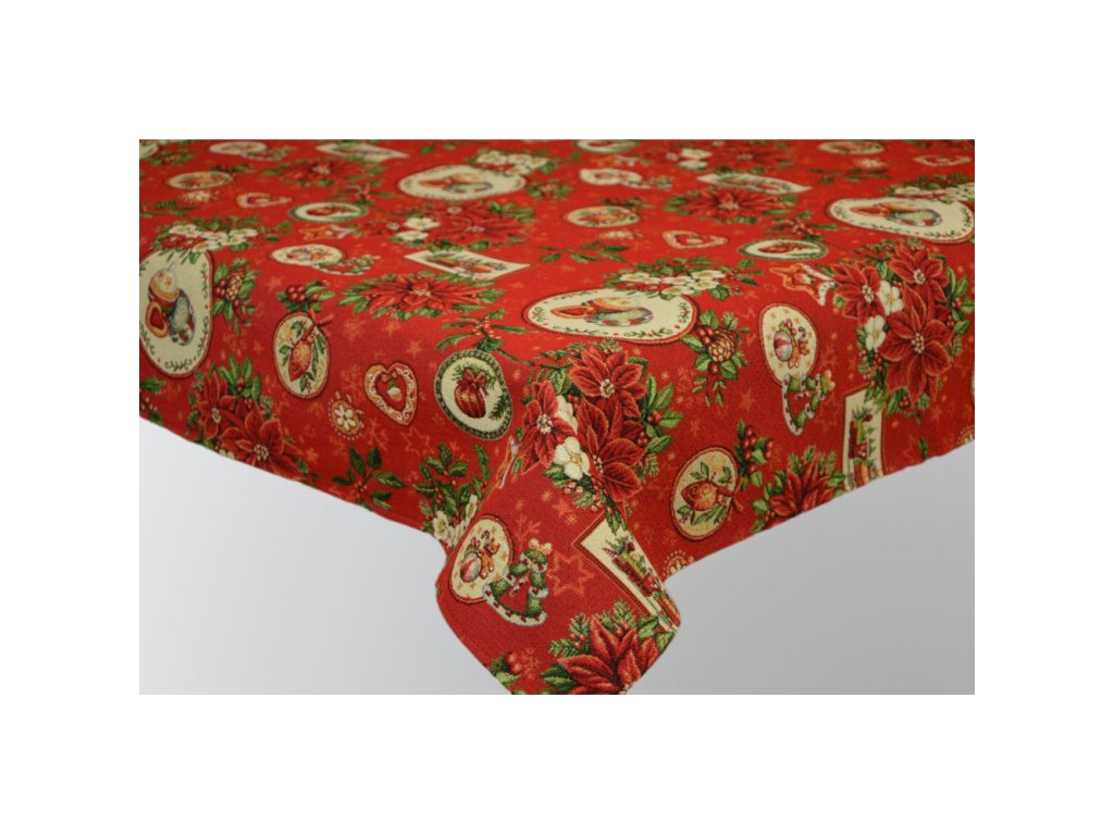 Vianočný gobelínový obrus so vzorom vianočnej ruže a vianočných gulí.