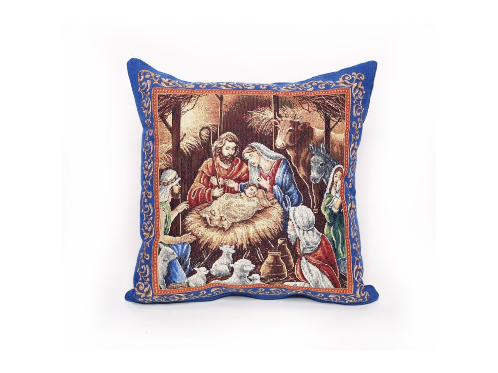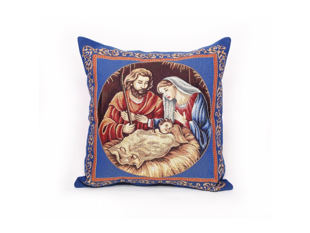 Vianočný gobelínový vankúš so svätou rodinou a lesklým vláknom Lurex