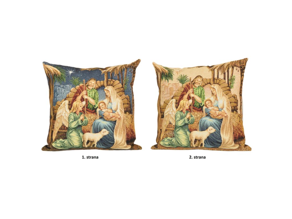 Vianočný gobelínový vankúš so svätou rodinou a lesklým vláknom Lurex