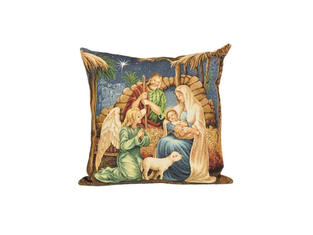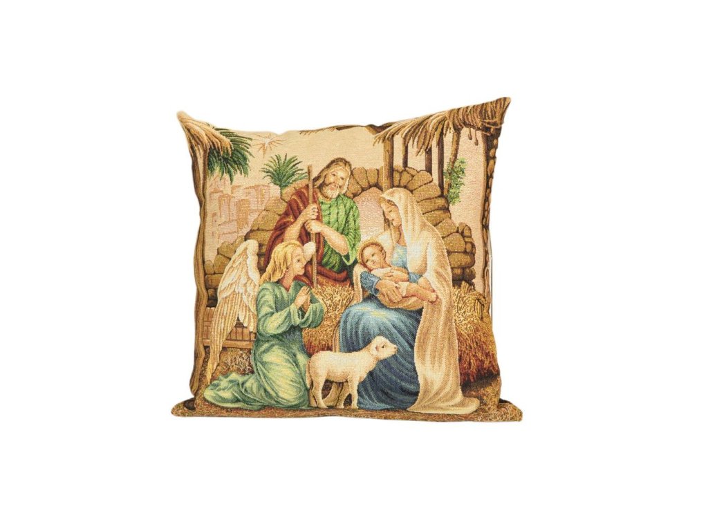Vianočný gobelínový vankúš so svätou rodinou a lesklým vláknom Lurex
