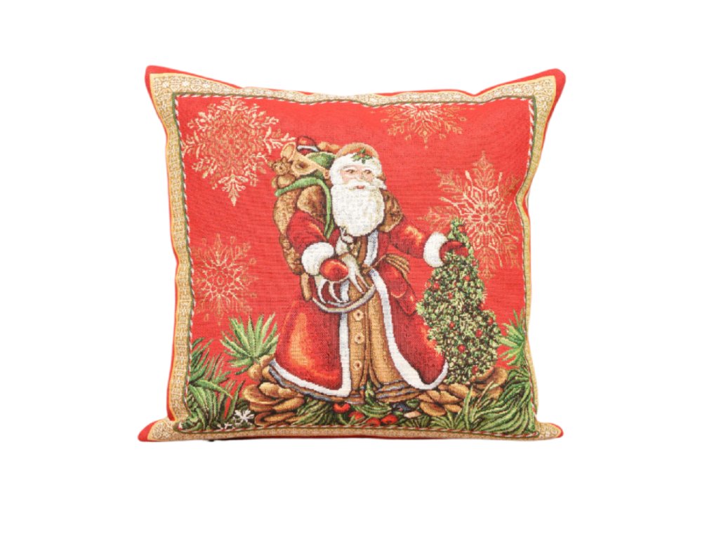 Vianočný gobelínový vankúš z jednej strany so Santom a s druhej strany s vianočným mestečkom s lesklým vláknom Lurex