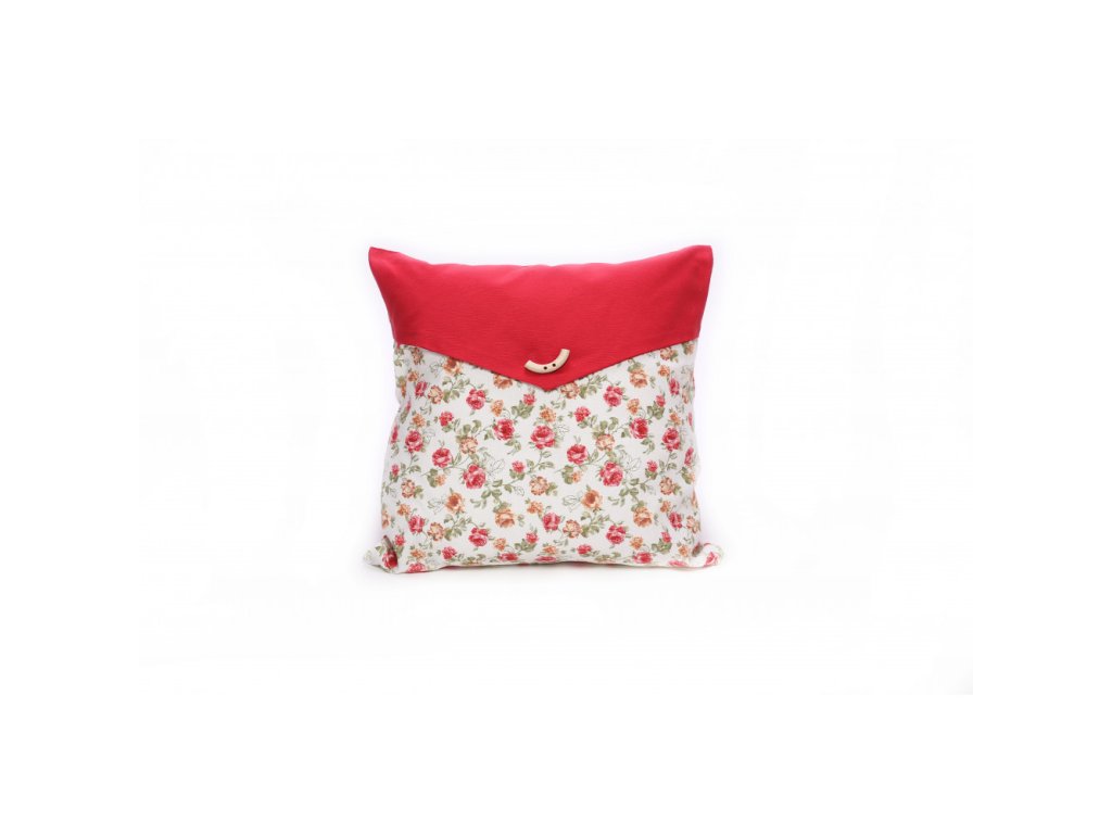 Dekoračný vankúš so vzorom kvetov a ozdobnou príklopkou. Z jednej strany je skrytý zips pre jednoduché navliekanie.